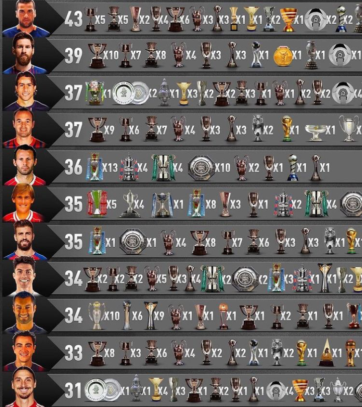 Andrés Iniesta is the 4th top player with the most trophies as he has won 37 Trophies playing for Barcelona, Vissel Kobe, and Spain.