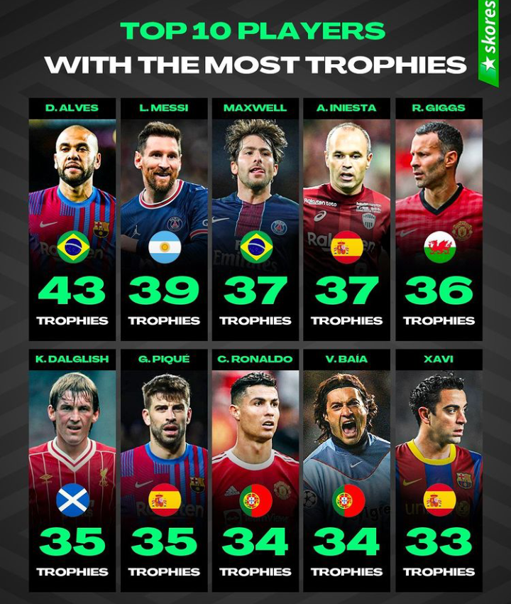 Cristiano Ronaldo is the 8th top player with the most trophies as he has won 34 Trophies playing for Sporting CP, Manchester United, Real Madrid, Juventus, and Portugal.